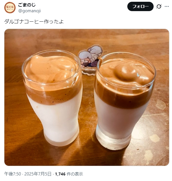韓国風ホームカフェといえば、まずはこれ。2020年にSNSで大流行して以来、今でも定番中の定番。ふわふわのコーヒークリームがミルクの上に浮かぶ、あの見た目が最高に映える。