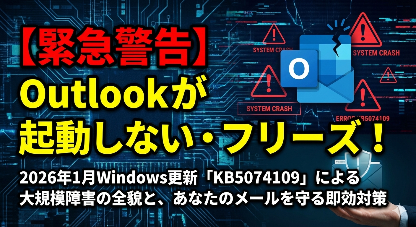 この大規模な問題の引き金となったのは、2026年1月13日に配信されたWindowsのセキュリティ更新プログラム「KB5074109」です。この更新プログラムを適用した一部の環境で、特に「クラシック版Outlook」を使用し、POPアカウントやPSTファイルを利用している場合に、アプリケーションが頻繁にフリーズしたり、起動できなくなったりする症状が報告されています。