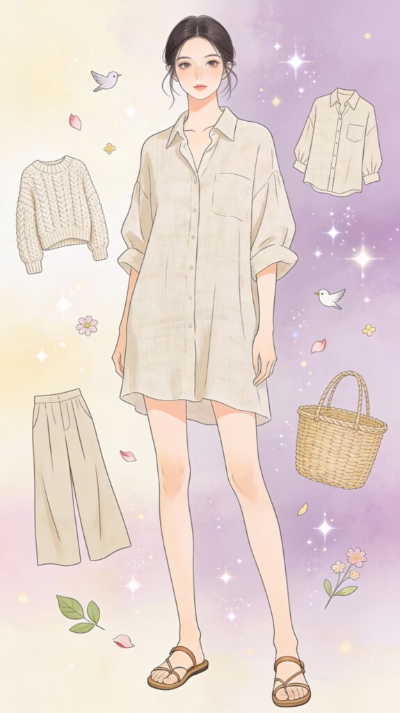 ナチュラルコーデ リネンシャツ+ワイドパンツ+サンダル。2026年トレンドカラー「クラウドダンサー(白)」を取り入れて。