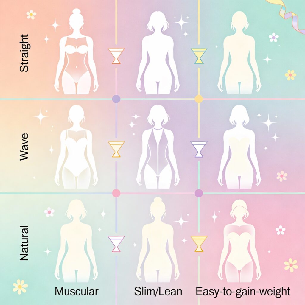 ただし、体重の増減によって**「目立つ特徴」が変わる**ことはあります。例えば、痩せているときは骨感が目立ち「ナチュラル寄り」に見えても、太ると肉感が出て「ストレート寄り」に見えることも。