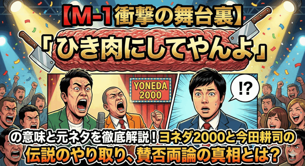 【M-1衝撃の舞台裏】「ひき肉にしてやんよ」の意味と元ネタを徹底解説!ヨネダ2000と今田耕司の伝説のやり取り、賛否両論の真相とは?