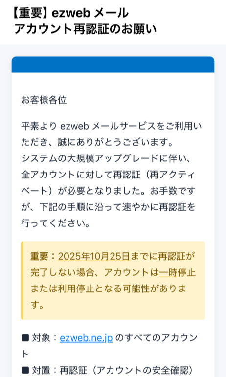 5. ezweb.ne.jpの現状との矛盾 ezweb.ne.jpドメインは2018年4月以降、新規提供は終了していますが、既存利用者は引き続き使用可能です。しかし、全アカウントに対して一斉に再認証を求めるような大規模な対応を、KDDIが告知なしに実施することは考えられません。