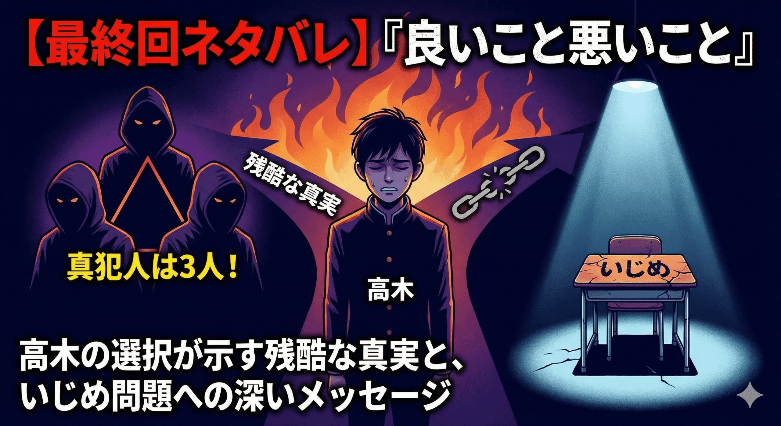 この記事では、ドラマ『良いこと悪いこと』の最終回を徹底的にネタバレ解説します。真犯人は誰だったのか、高木の最後の選択は何を意味するのか、そしてこの物語が私たちに突きつけた「いじめ」という重いテーマについて、公式情報やSNS上の様々な意見を交えながら、多角的に深く掘り下げていきます。最終回の展開に疑問を感じた方、物語の奥深さをさらに理解したい方、そしてこのドラマが投げかけた問いについて一緒に考えたい方は、ぜひ最後までお付き合いください。