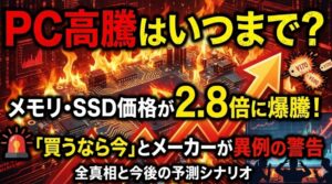本記事では、PC高騰の背景にあるAIブーム、為替変動、Windows 10サポート終了という複合的な要因を分析し、過去の価格サイクルとの比較、そして具体的な受注停止の実態を詳細に解説しました。