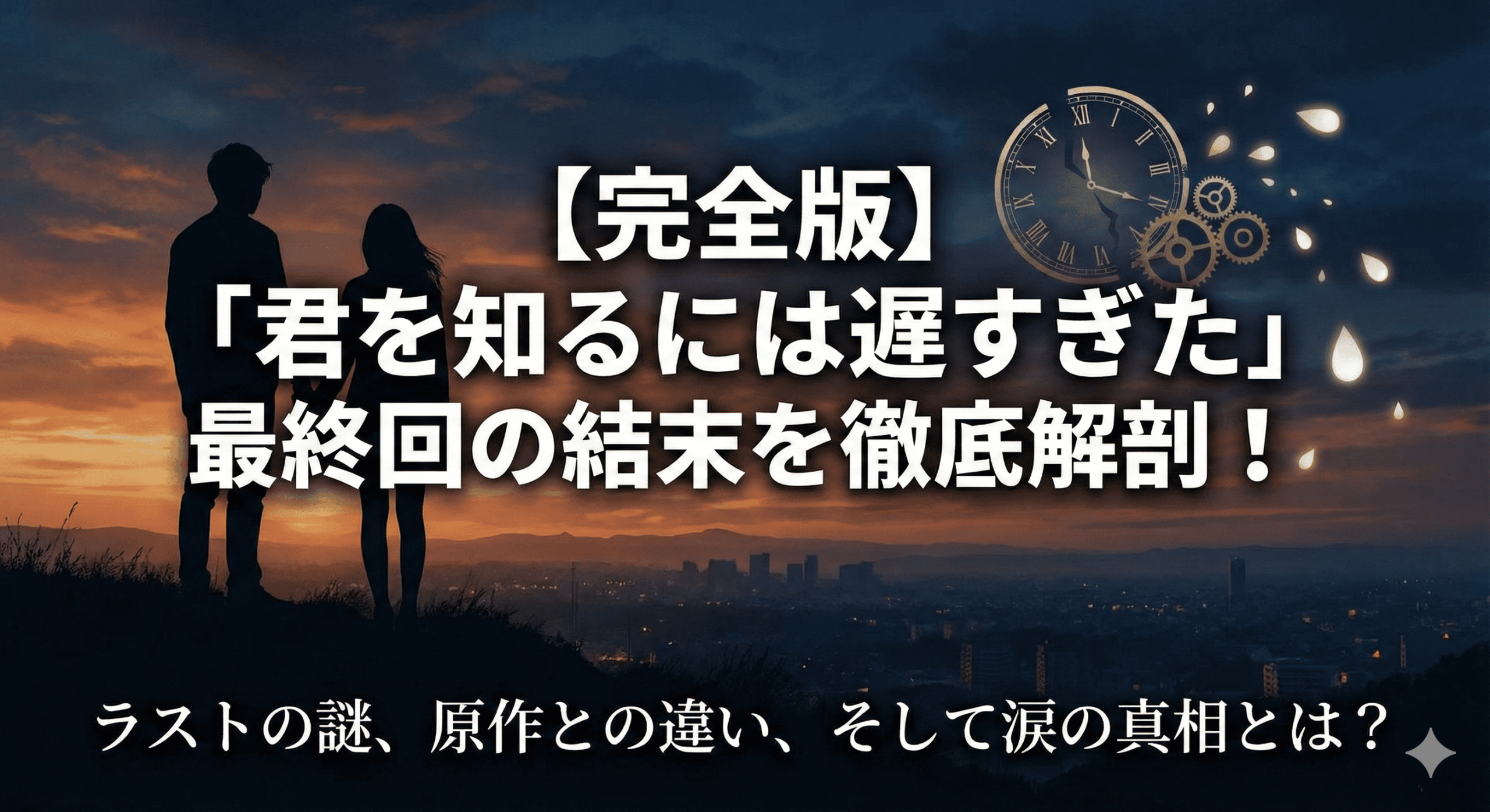 この記事では、前回お届けした基本的な解説からさらに一歩踏み込み、「君を知るには遅すぎた」の最終回、その結末とラストシーンの真相に、あらゆる角度から迫ります。ドラマ版の最終回で何が起こったのかを詳細に解説するだけでなく、衝撃的な原作小説との違い、散りばめられた伏線の完全な回収、そして登場人物たちの深層心理までを徹底的に分析。この記事を読み終えたとき、あなたは「君を知るには遅すぎた」という物語が、なぜこれほどまでに私たちの心を掴んで離さないのか、その本当の理由を理解することになるでしょう。