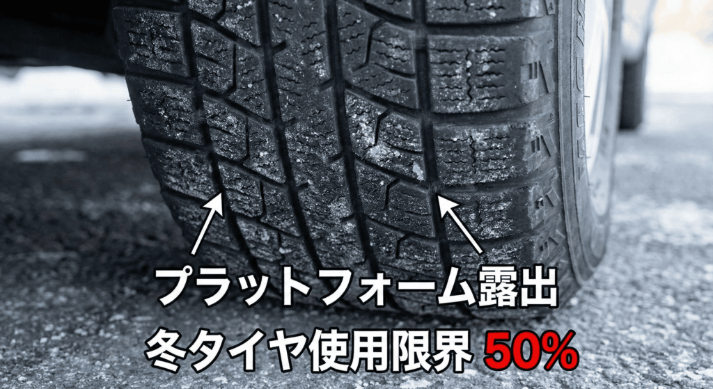 プラットフォームは、新品時の溝の深さから50%摩耗したことを示すサインで、スリップサインとは別に溝の中に設けられています。スタッドレスタイヤは、このプラットフォームが露出すると、冬用タイヤとしての性能(特に雪を排出する能力や氷上のグリップ力)が著しく低下するため、冬用タイヤとしては使用できなくなります。