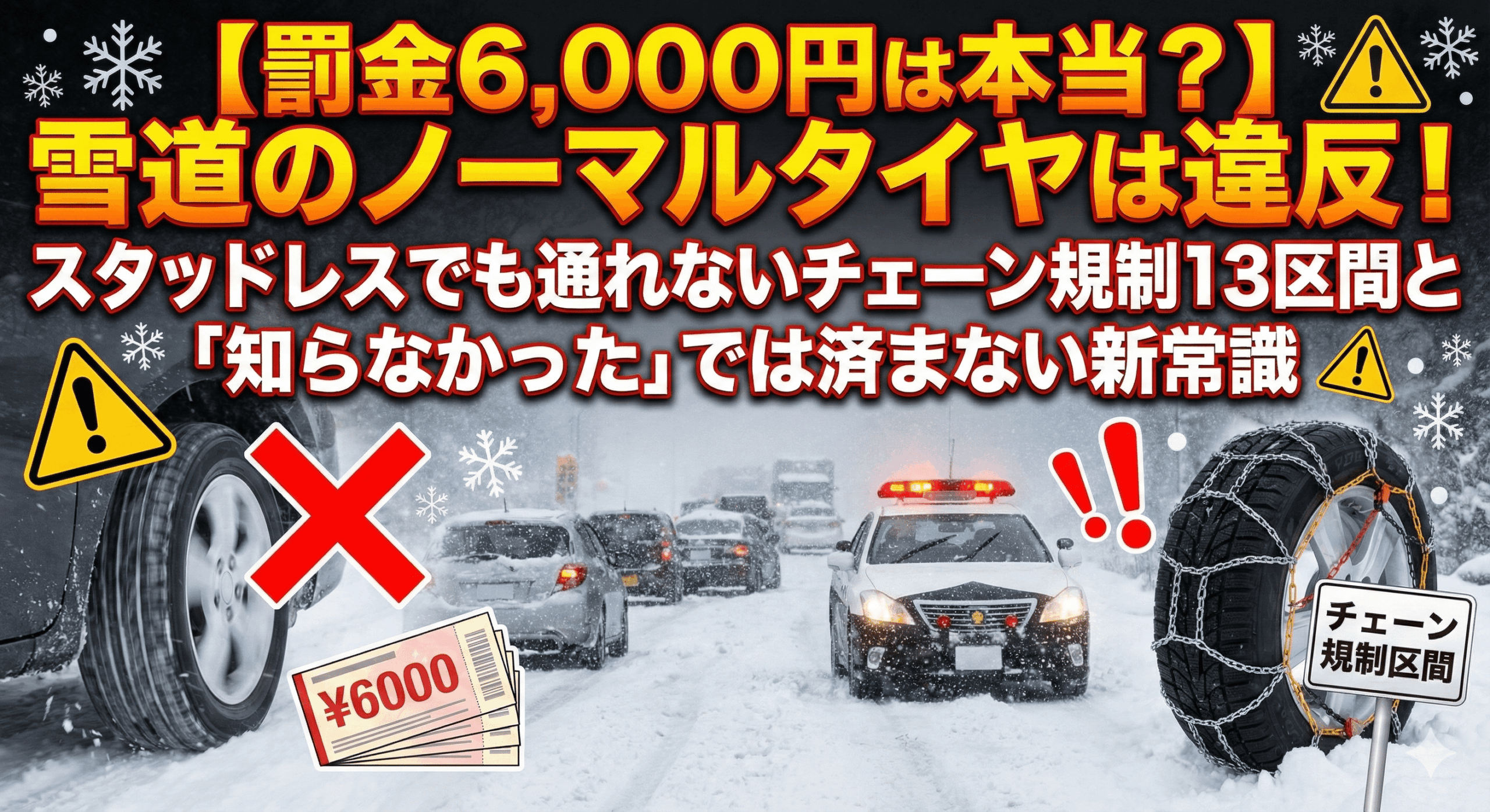 この記事では、雪道でのノーマルタイヤ走行の危険性と違法性、そして近年厳格化された交通規制について、多角的に解説してきました。