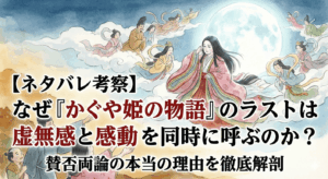 特に、物語のクライマックス。月に帰るかぐや姫と地上に残される人々との別れのシーン。月の使者たちが奏でる音楽の不気味さ、そして、羽衣をまとった瞬間に地球での記憶をすべて失い、それでもなお故郷の星を振り返るかぐや姫のあの表情……。胸にぽっかりと穴が空いたような虚無感と、どうしようもない切なさが入り混じった、複雑な感情に包まれた方も少なくないはずです。その感覚をうまく言葉にできず、もどかしい思いを抱えているかもしれません。