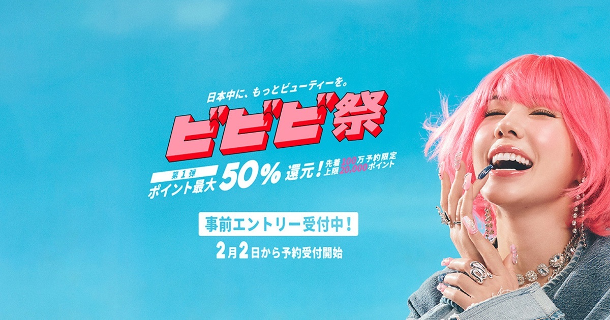 「ビビッとときめく還元キャンペーン!!」(通称:ビビビ祭)は、ホットペッパービューティー史上最大級のポイント還元企画です。仲里依紗さん出演のCMが1月5日から放映され、話題を集めています。