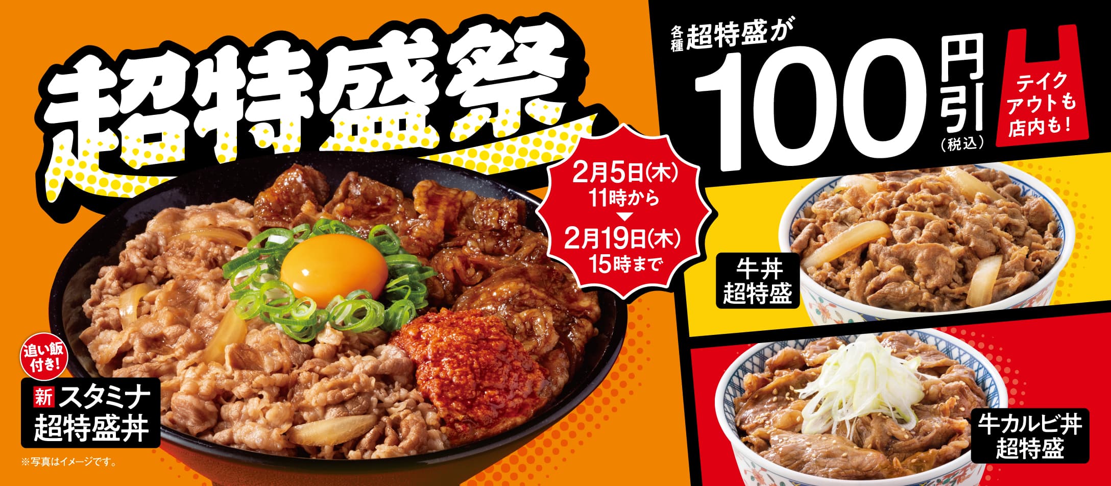 | 割引内容 | 対象の「超特盛」メニューが、店内・テイクアウトともに税込価格から100円引き |