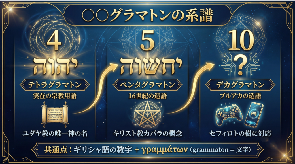 深い関係があります。デカグラマトンは、テトラグラマトンの命名規則(ギリシャ語の数字+grammaton)を借用して作られました。ブルアカの開発陣が、実在の宗教用語であるテトラグラマトンを元ネタとして、その数字を「4」から「10」に拡張して「デカグラマトン」という新しい言葉を創作した、と考えるのが自然です。片や実在の宗教用語、片やフィクションの用語という違いはありますが、その発想の原点という意味で、両者は切っても切れない関係にあります。