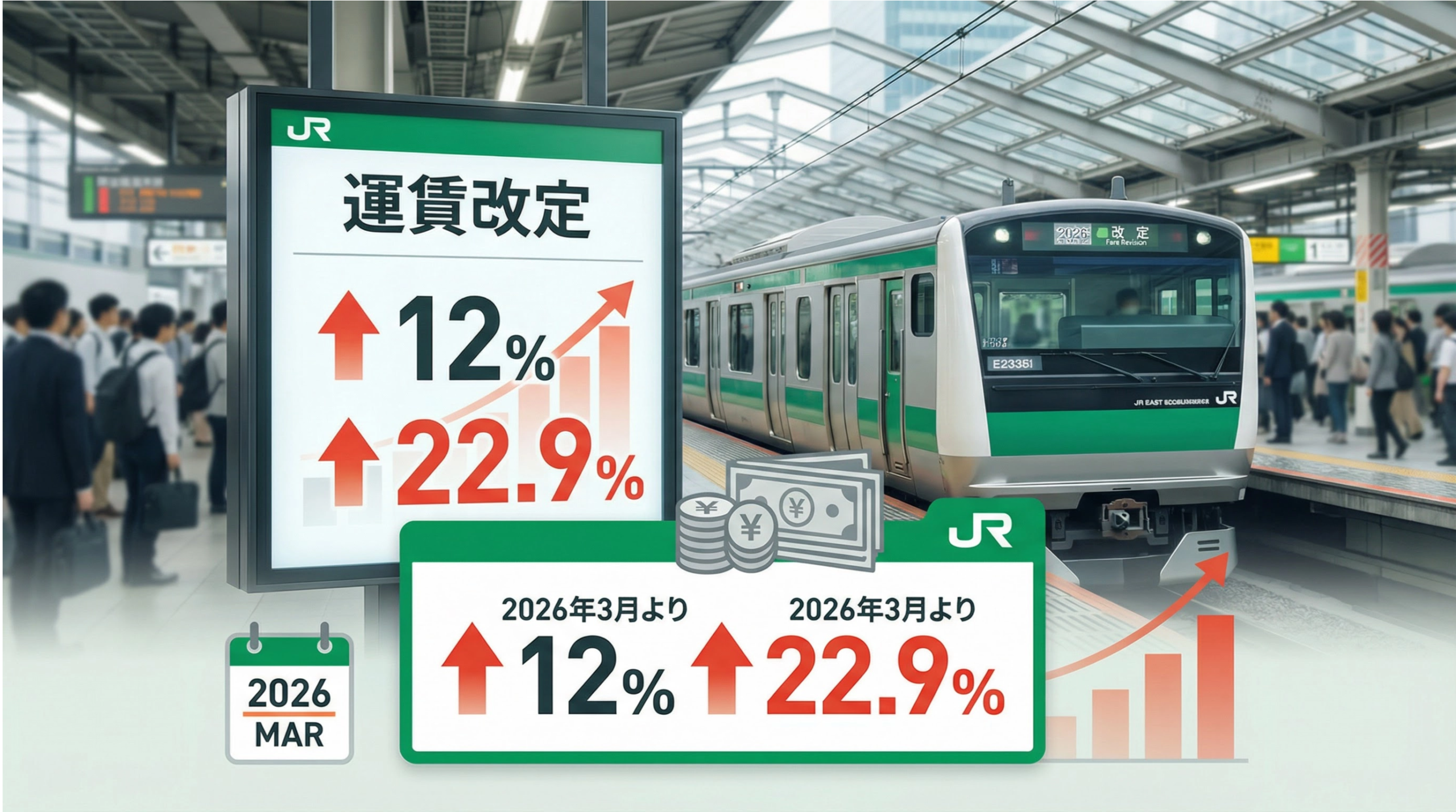 2026年3月14日、JR東日本は民営化以来初となる運賃の「本体値上げ」に踏み切ります。消費税率の改定に伴う値上げは過去にもありましたが、今回はそれとは根本的に性質が異なります。私たちの生活にどのような影響があるのか、まずは変更点の概要を見ていきましょう。