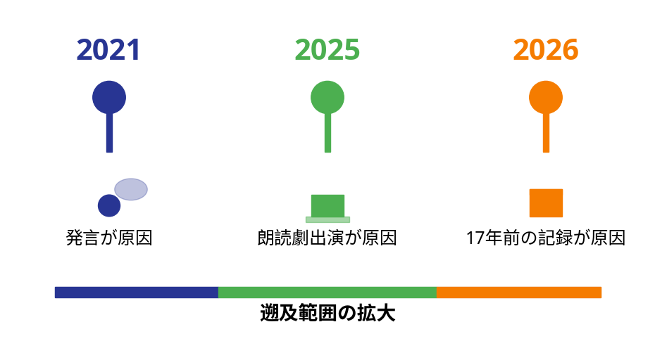 つまり、問題視される行為の時間的な遡及範囲が事例を重ねるごとに広がっているということです。また、茅野さんは「靖国参拝の発言」、森久保さんは「政治的テーマへの関与」、佐藤さんは「偶然の訪問の記述」と、問題視される行為のハードルも下がっているように見えます。