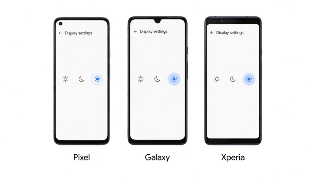 各機種のダークテーマ設定画面に「スケジュール」の項目があります。「日の入りから日の出まで」もしくは「指定時間」を選ぶと自動切り替えが可能です。Galaxy・Pixelともにバッテリーセーバーとの連動設定も選択できます。